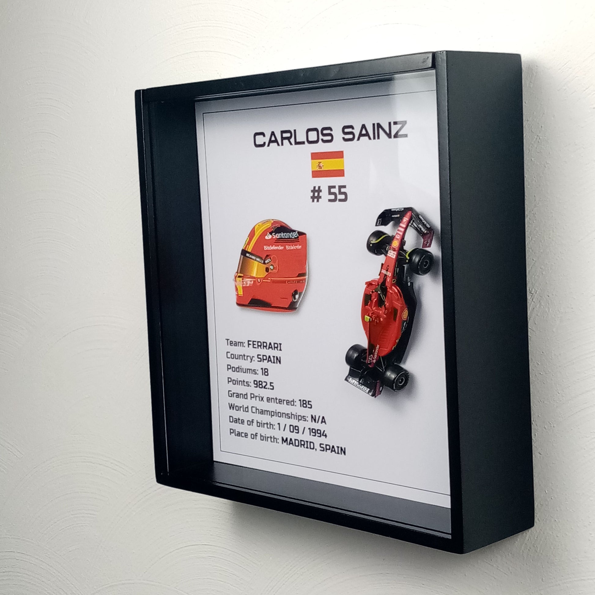 Descripción: Cuadro tipo caja de mdf color negro, con tapa deslizable de acrílico transparente de 3mm, Impresión en HD, auto F1, escala 1:43 (SF23, #55, 2023)