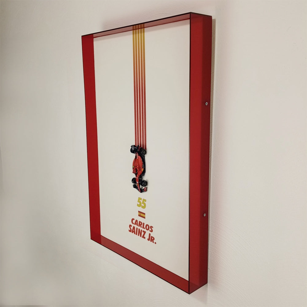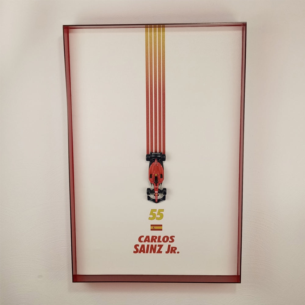 Descripción: Bastidor de madera de pino, impresión en HD sobre tela canvas, marco de acrílico de 3mm, auto F1, escala 1:43 (SF23, #55, 2023)