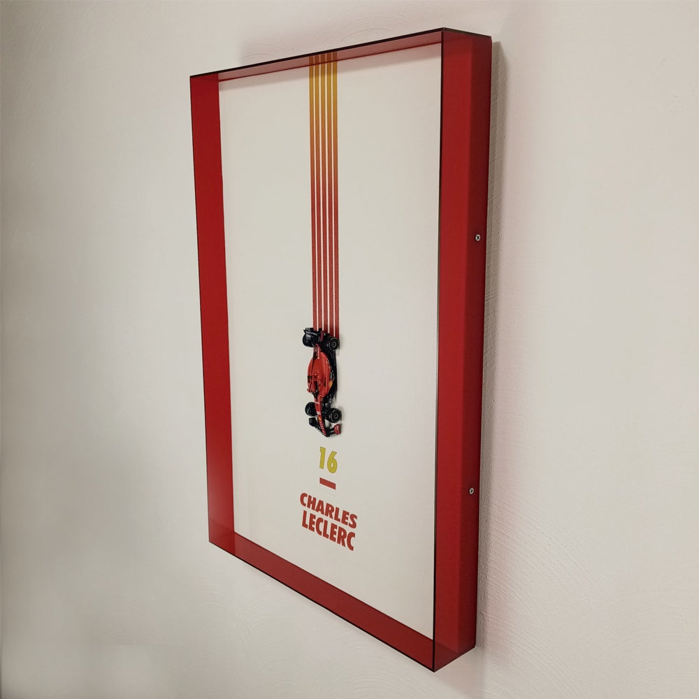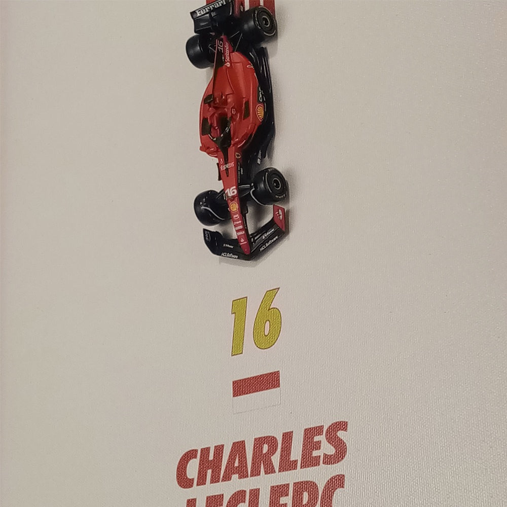 Descripción: Bastidor de madera de pino, impresión en HD sobre tela canvas, marco de acrílico de 3mm, auto F1, escala 1:43 (SF23, #16, 2023)