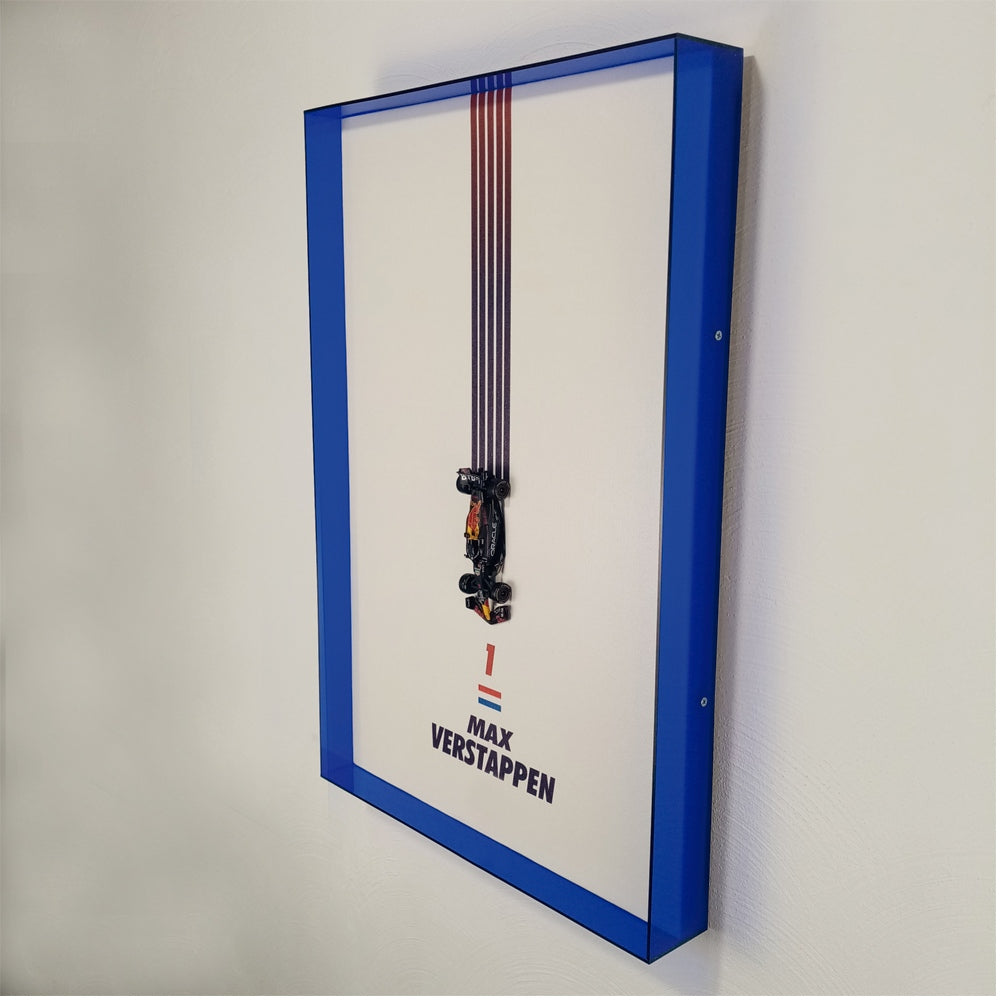 Descripción: Bastidor de madera de pino, impresión en HD sobre tela canvas, marco de acrílico de 3mm, auto F1, escala 1:43 (RB 19, # 1, 2023)