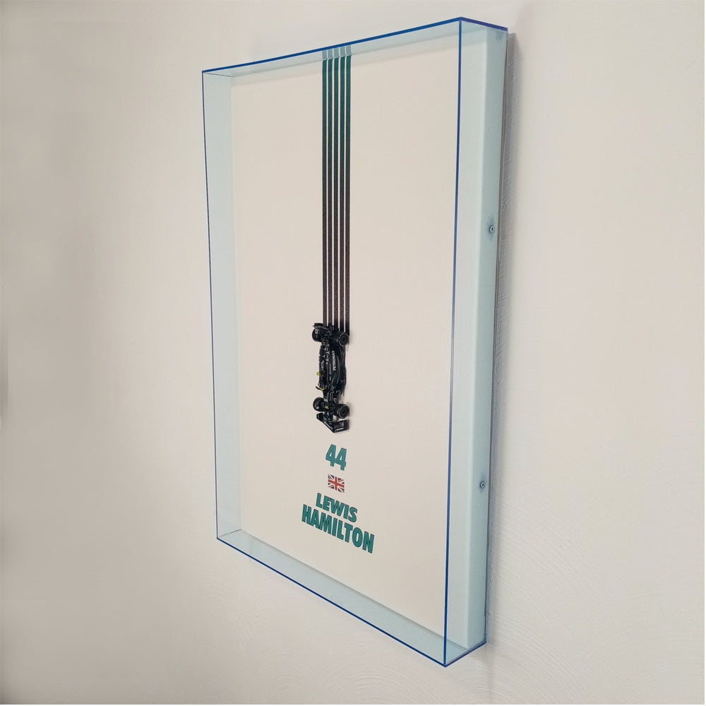 Descripción: Bastidor de madera de pino, impresión en HD sobre tela canvas, marco de acrílico de 3mm, auto F1, escala 1:43 (W14, #44, 2023)